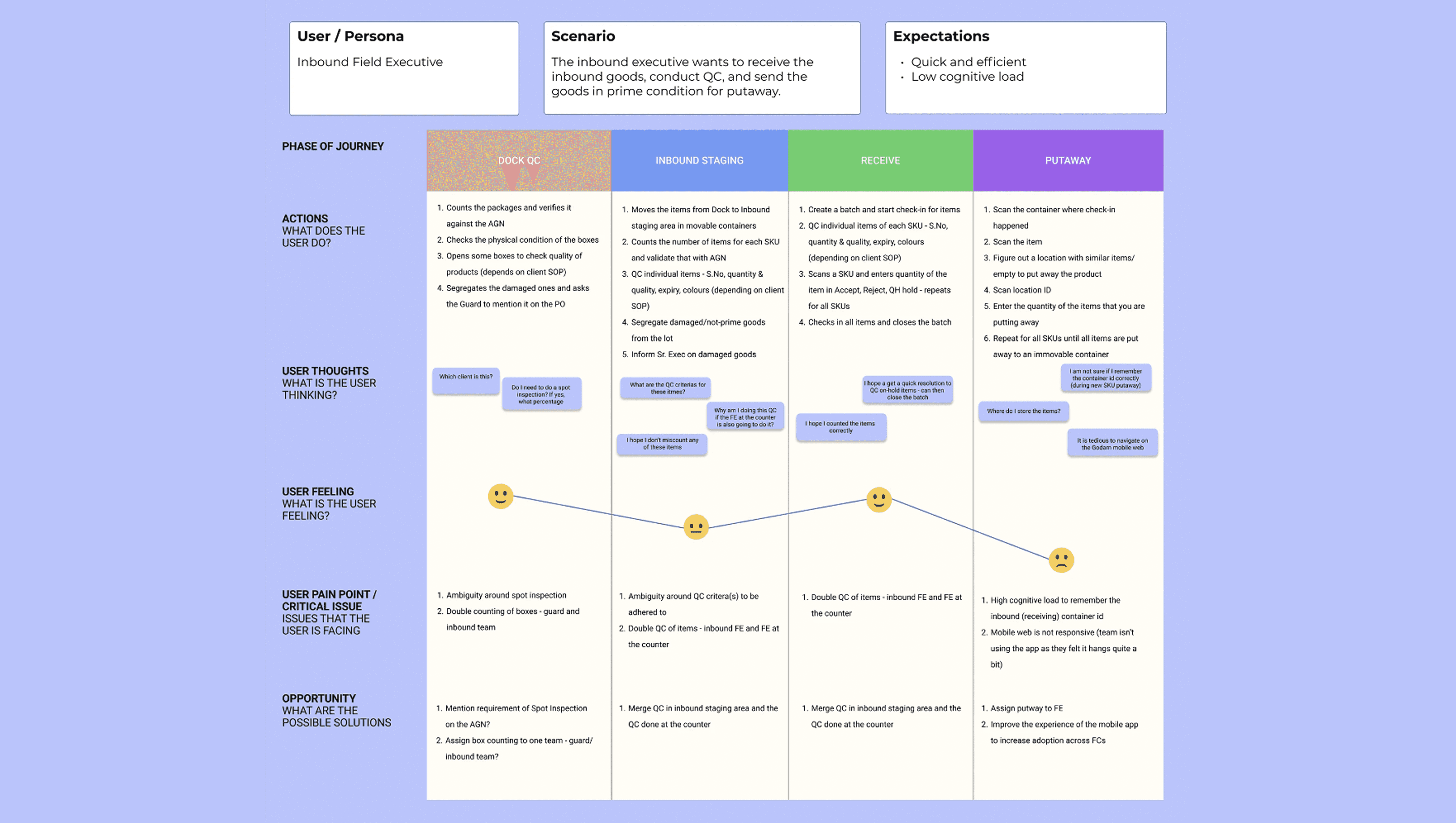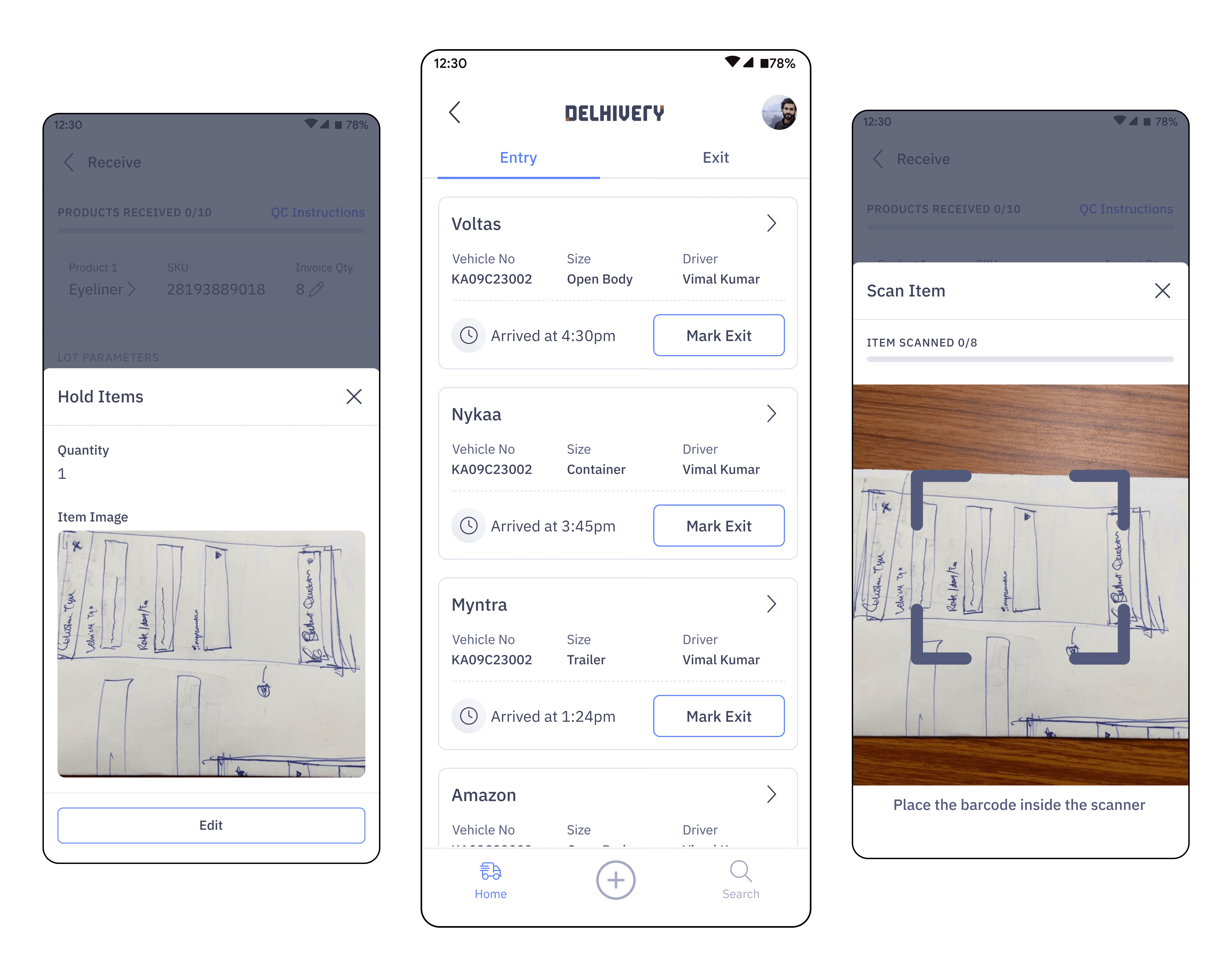 Godam, Delhivery's warehouse management system, had low adoption across 85+ fulfillment centers, workers had turned it into a passive record-keeping tool and built manual workarounds to get actual work done. As the lead designer, I drove a ground-up redesign starting with on-site research across warehouses in Bangalore, Chennai, and Haryana, mapping workflows and identifying three core blockers: low system adoption due to poor IA, lack of standardization across warehouses, and a PWA that failed in low-connectivity environments. The solution introduced role-based interfaces, an offline-first mobile experience with tap-friendly interactions, and modular redesigns that matched how work actually flows.