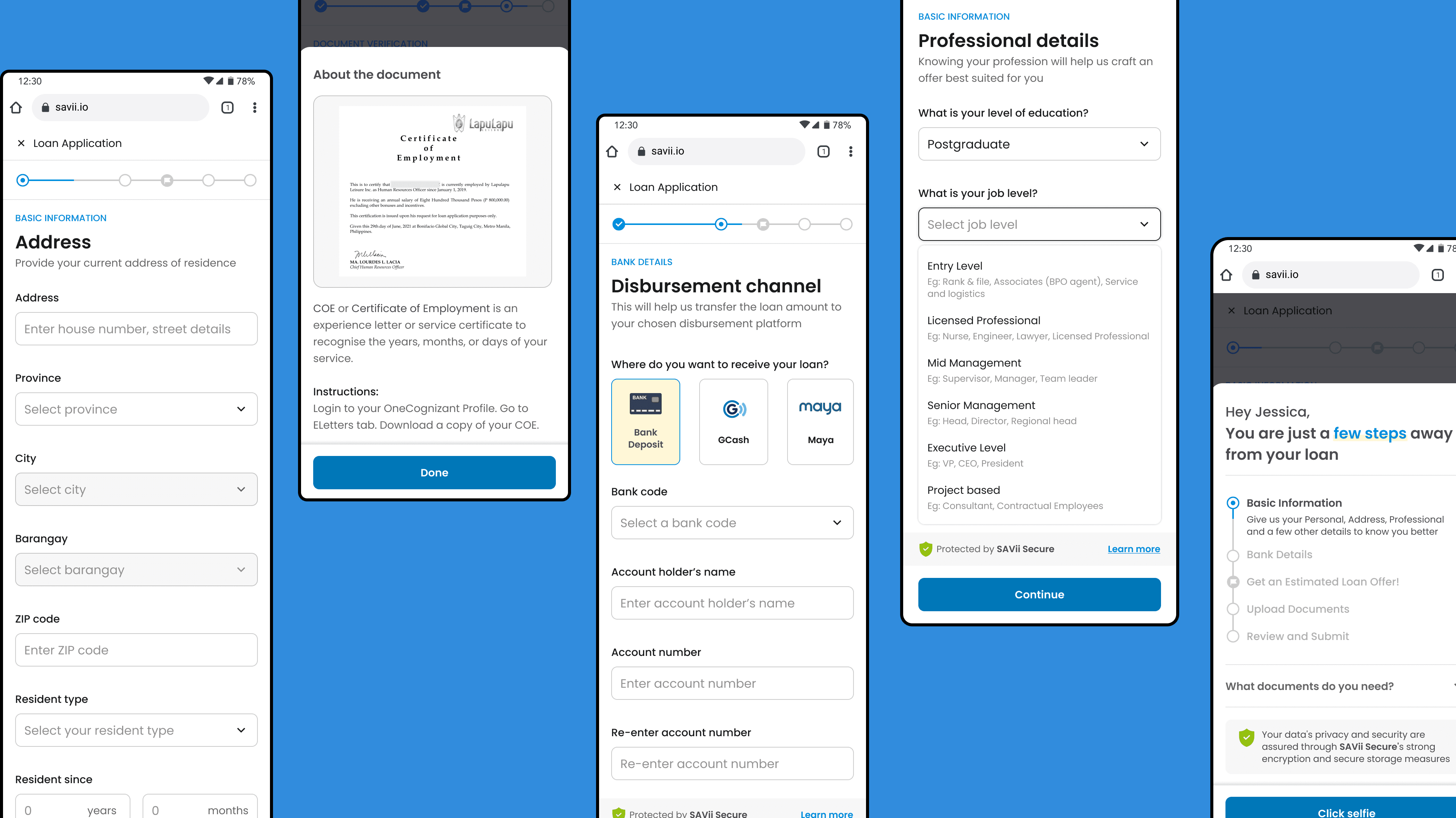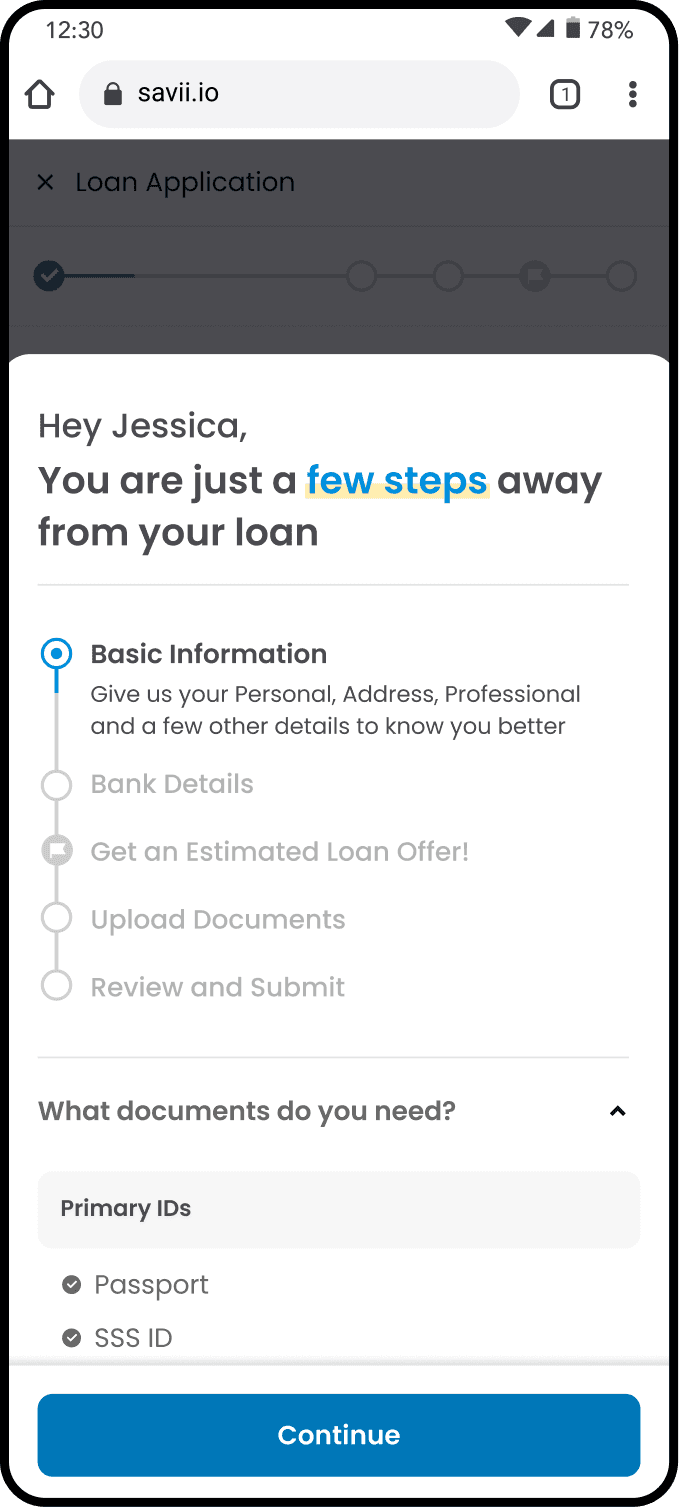 SAVii, a salary-linked loan platform for employees in The Philippines, faced high drop-off rates throughout their loan application process. As Product Designer II, I led a 6-month redesign using data-driven insights to identify three major friction points: lengthy application forms (12% drop-off), cognitive overload on loan offers (14% drop-off), and poor document upload readiness (25% drop-off). The solution reorganized information flow into logical steps, streamlined decision-making through progressive disclosure, and enhanced user readiness with upfront guidance. This resulted in an 11% decrease in drop-off rates, 2x increase in first-pass document approvals, and positive user feedback.