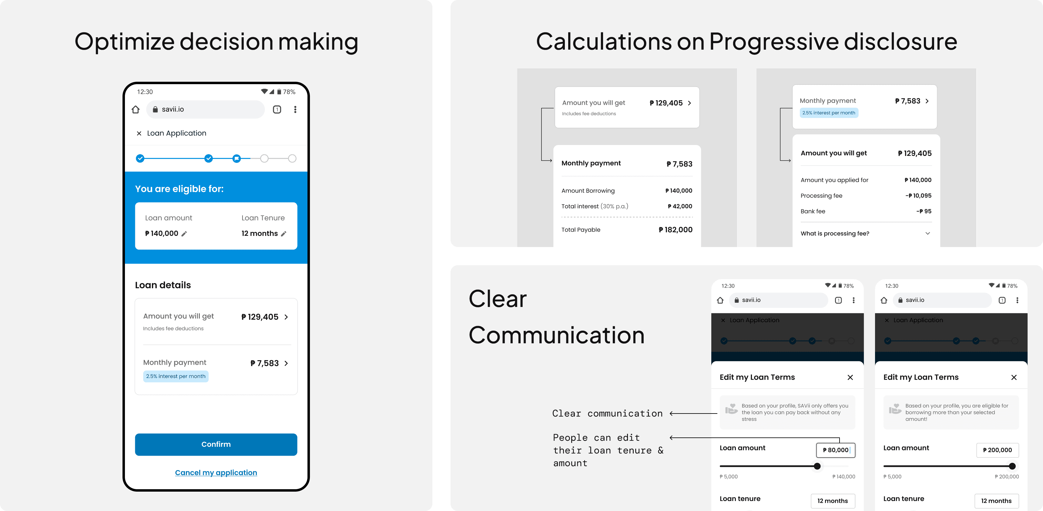 We identified a 14% drop-off on the loan offer screen and conducted an audit to uncover friction points. Using user feedback, we prioritized key decision-making factors and applied visual hierarchy and progressive disclosure to reduce cognitive overload.
