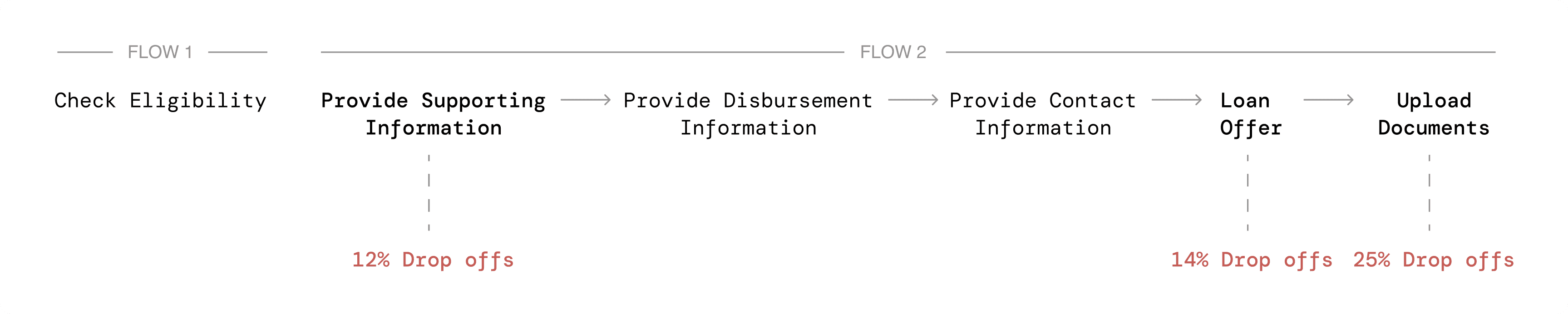 Users dropped off early due to a long, confusing form with no clear sense of progress. We found 12% of drop-offs happened during the supporting information section.